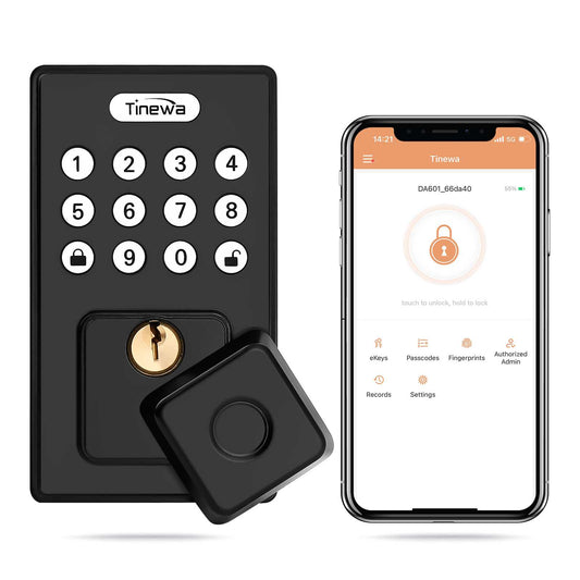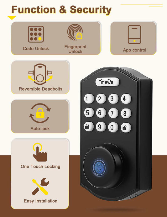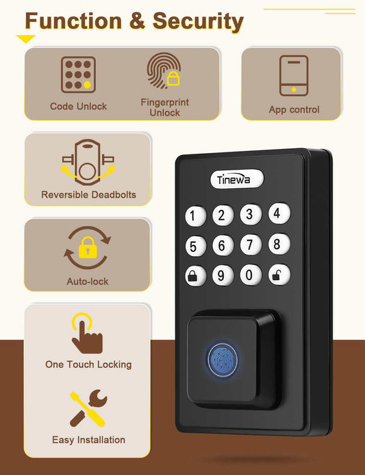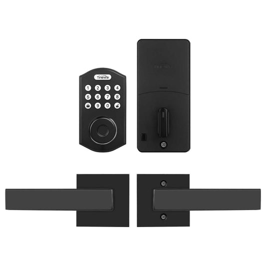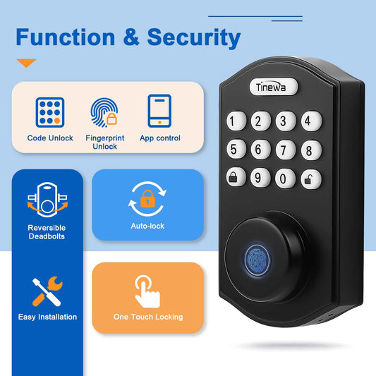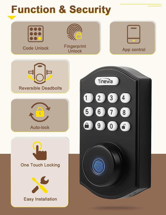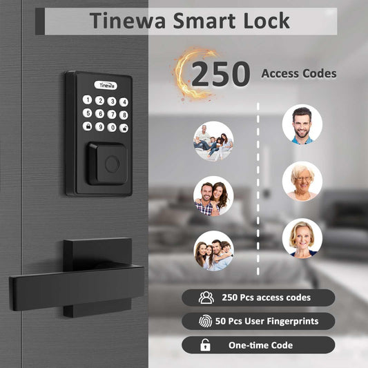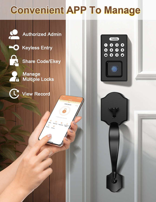 Tinewa Smart Door Lock Set for Front Door, Keyless Fingerprint Entry Door Lock with Handle, Electronic Deadbolt Digital Keypad for Airbnb Apartments, Bluetooth APP Control, Auto Lock, Black