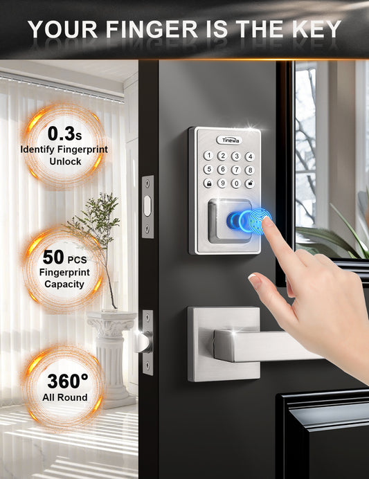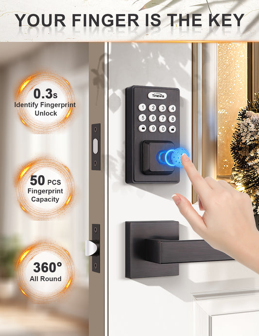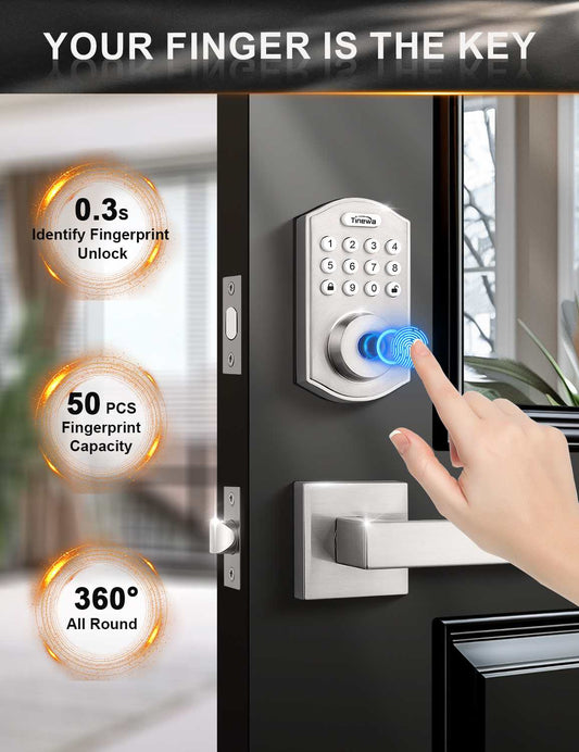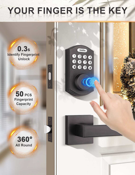 Tinewa Keyless Entry Door Lock with Handle, Fingerprint Door Lock with Door Knobs, Electronic Keypad Deadbolt Smart Front Door Lock Set, Front Door Handleset for Homes, Apartments, Easy to Install