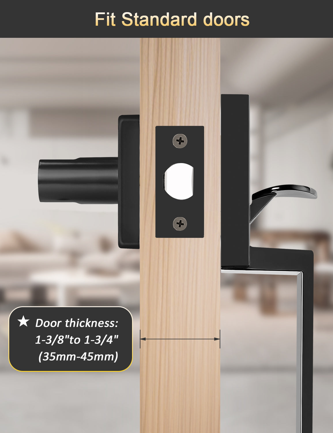 - Standard Door Fit: Compatible with universal latches for backsets of 2-3/8" (60mm) or 2-3/4" (70mm). Fits doors with a thickness range of 1-3/8" (35mm) to 1-3/4" (45mm).